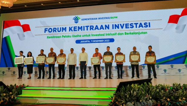 在論壇上,印尼投資部BKPM表彰了為印尼經(jīng)濟(jì)發(fā)展做出貢獻(xiàn)、助力印尼中小微企業(yè)發(fā)展的大型投資企業(yè),印尼投資環(huán)境發(fā)展部副部長Yuliot先生現(xiàn)場向10家國內(nèi)外知名企業(yè)頒發(fā)“2022年BKPM投資合作伙伴獎”。中偉股份在印尼的合資控股企業(yè)——印尼中青新能源有限公司(簡稱“PT ZTEN”)獲此殊榮,中偉國際副總裁符培文代表公司上臺領(lǐng)獎。